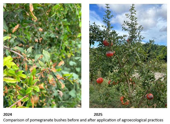 The women now produce ecological fruits and vegetables – olives, oranges, pomegranates, grapes, peppers for harissa, aromatic plants such as geranium – and their yields and product quality have visibly improved. One example is a pomegranate orchard that had previously been declining: after switching to agroecological practices, the trees produced abundant, healthy fruit again.